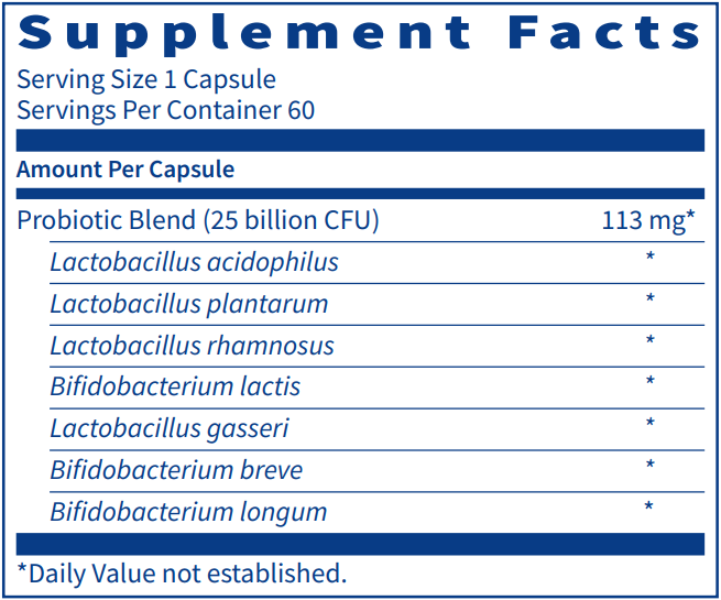 Probiotics may support healthy levels of hormones and proteins related to appetite and fat storage, as well as support healthy inflammation modulation, which is often associated with weight gain. Ther-Biotic® Metabolic Formula is a blend of 7 select probiotic species in a cellulose base. Designed to increase intestinal diversity and support healthy metabolism and weight management, each capsule provides 25 billion CFU.