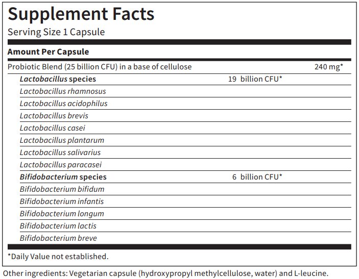 This broad-spectrum, 12-strain blend of 7 Lactobacillus and 5 Bifidobacterium species is provided in a base of purified plant cellulose.