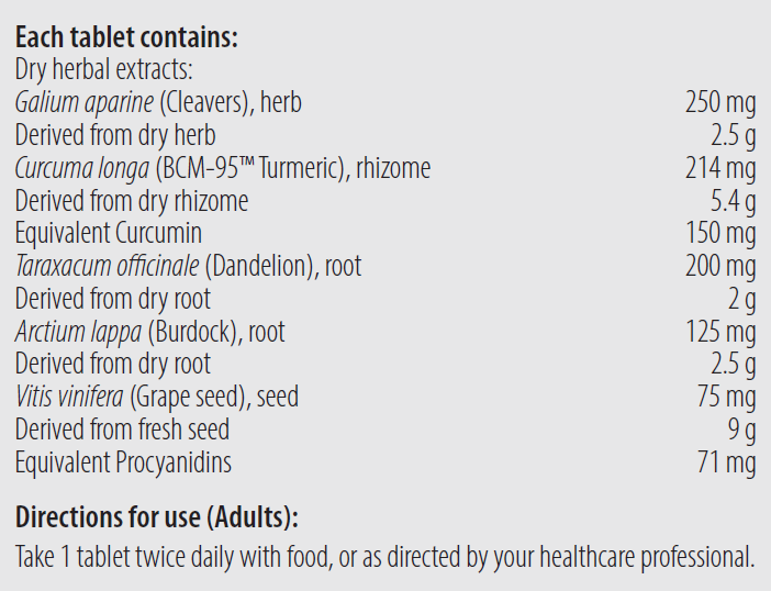 Acne and Rosacea: Curcumin and Grape seed extract suppress the growth of gram-positive bacteria, which may assist in reducing the bacteria involved in acne. Cleavers and Burdock have immune-regulatory and anti-bacterial activity, which may assist in reducing skin inflammation and targeting the acne causing bacteria. Rosacea is a skin condition characterized by dysregulated inflammatory, vascular and lymphatic processes. Down-regulation of such inflammatory mediators with curcumin and support of the vascular and lymphatic systems with Grape seed extract may provide relief of associated inflammatory symptoms including redness.