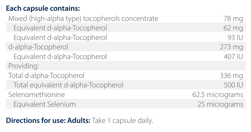 - E500 Tocopherols Plus Selenium may help to maintain a normal, healthy cardiovascular system. A prospective, cohort study over two years reported a positive correlation between vitamin E supplementation and cardiovascular health. The mechanism by which vitamin E may maintain a healthy cardiovascular system is via the protection of lipids, DNA and proteins from peroxynitrite dependent damage. D-gamma –tocopherol in particular is required to remove the nitrating ability of peroxynitrite. Selenium provides antioxidant activity by assisting in the formation and function of the selenium-dependent glutathione peroxidases.