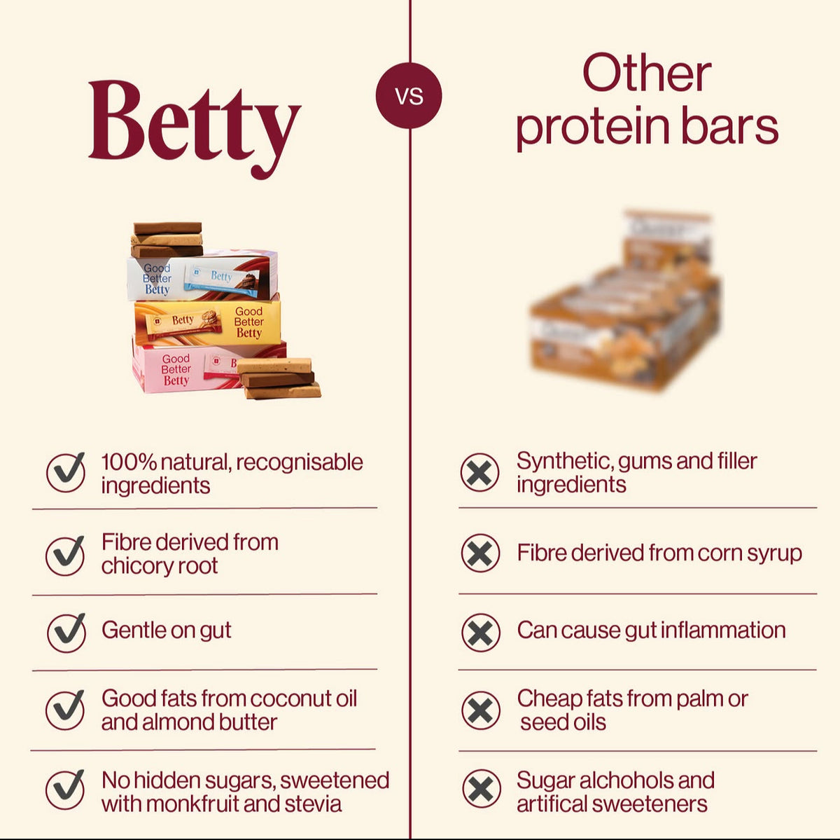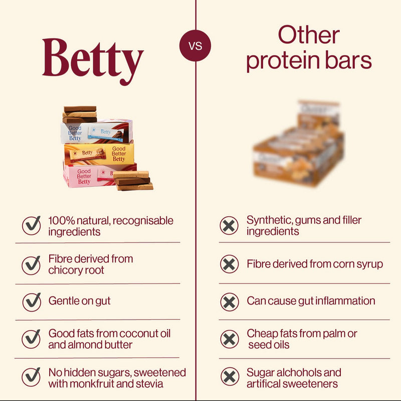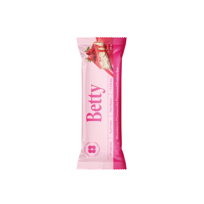 Strawberry Cheesecake Betty Bar packs 16 grams of protein per serve, is an excellent source of fibre, good source of zinc, and contains 500 million CFU (colony forming units) of probiotics for gut health. With a modest 195 calories and only 4.5g of sugar, this delicious bar ticks all the boxes.