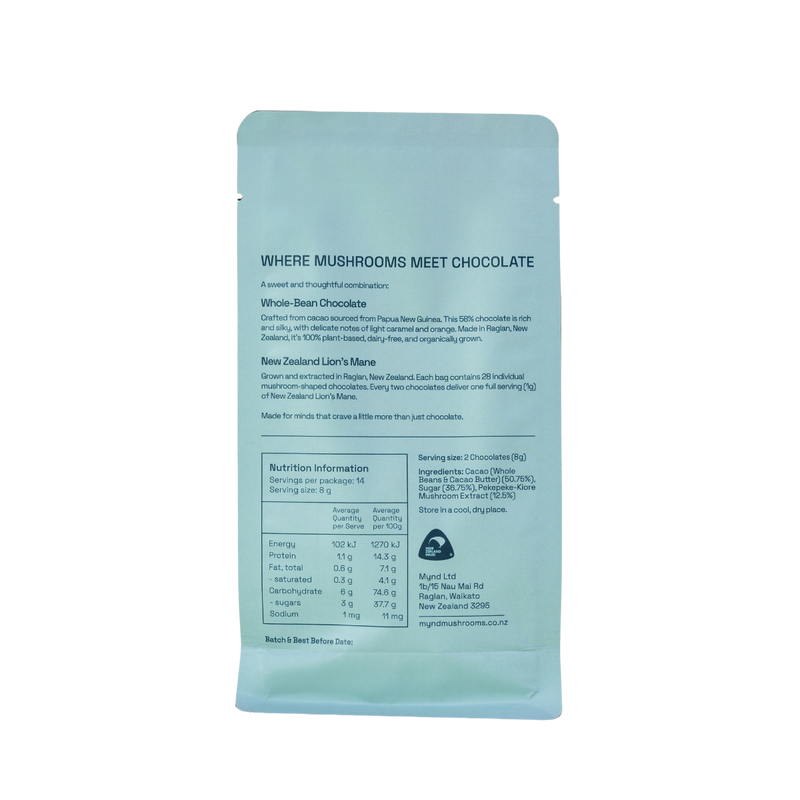 Each bag contains 28 individual mushroom-shaped chocolates. Every two chocolates deliver one full serving (1g) of New Zealand Lion’s Mane.