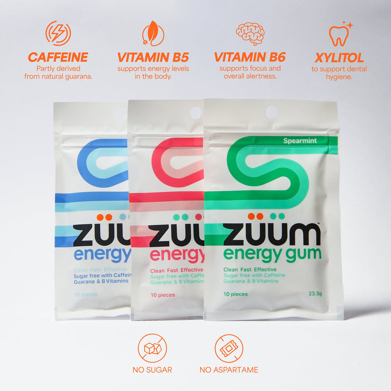 Watermelon is a go-to fruity flavour – think watermelon 5 Gum... but better. The fruity flavour is combined with a touch of spearmint to give Zuum Watermelon the refreshing taste you associate with a crunchy slice of watermelon on a hot Summer’s day. Combined with the natural sweetness of guarana and xylitol, you’ve got a watermelon-flavoured gum with unmatched flavour. The best part? Within 5 minutes of chewing, the active ingredients are fully absorbed into your system, energising you for your day ahead.