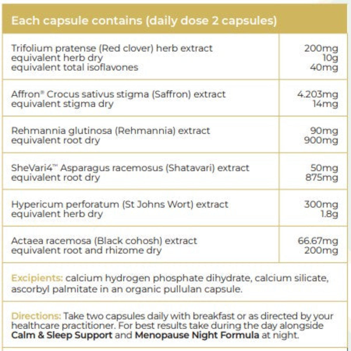 Menopause Day Formula supports women with low oestrogen levels who are in late perimenopause or postmenopausal. It helps to relieve hot flushes, irritability and vaginal dryness while also soothing nerves and supporting a healthy stress response and sleep patterns. For optimal oestrogen support, take in conjunction with Menopause Night Formula at night.