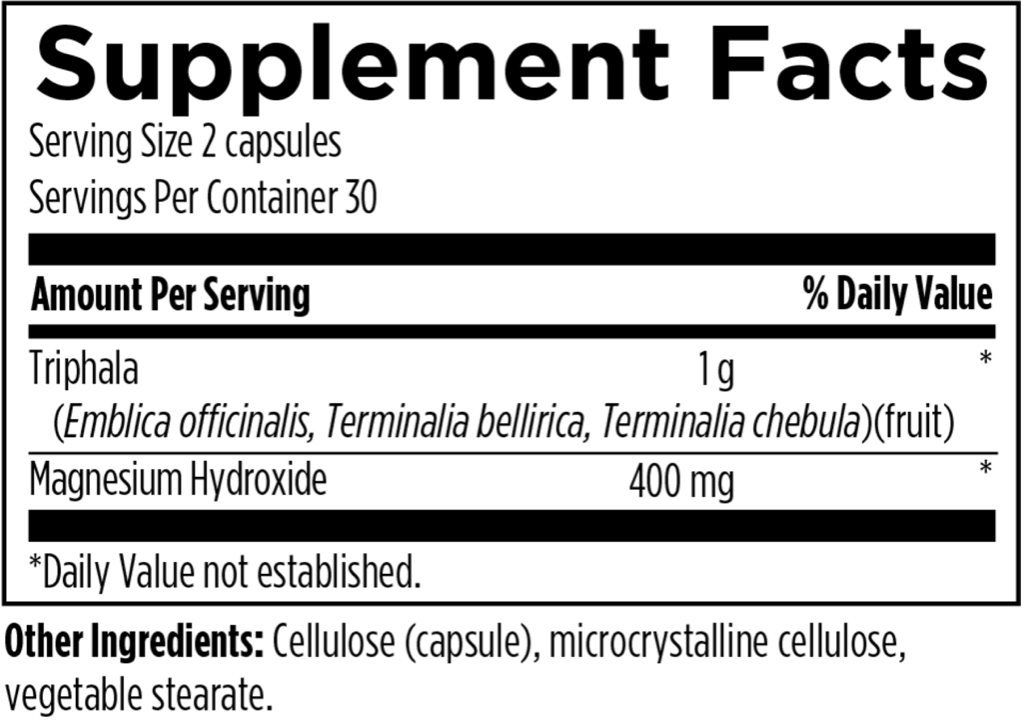 Colon Rx™ uses two proven ingredients to improve bowel motility and tonicity in people with occasional constipation. Magnesium hydroxide is a well known ingredient in laxative and antacid formulas, while Triphala is a classic formula in Ayurvedic medicine.