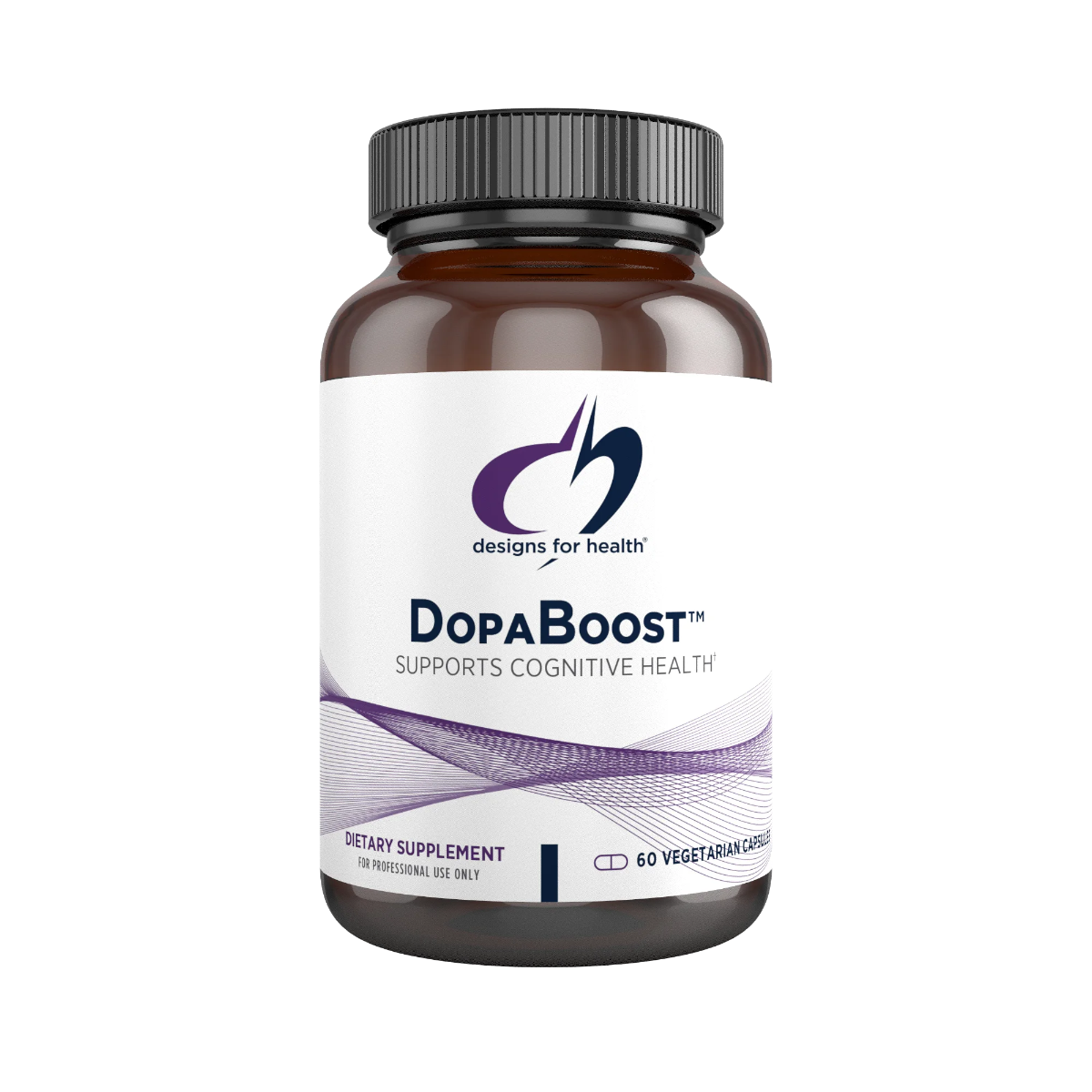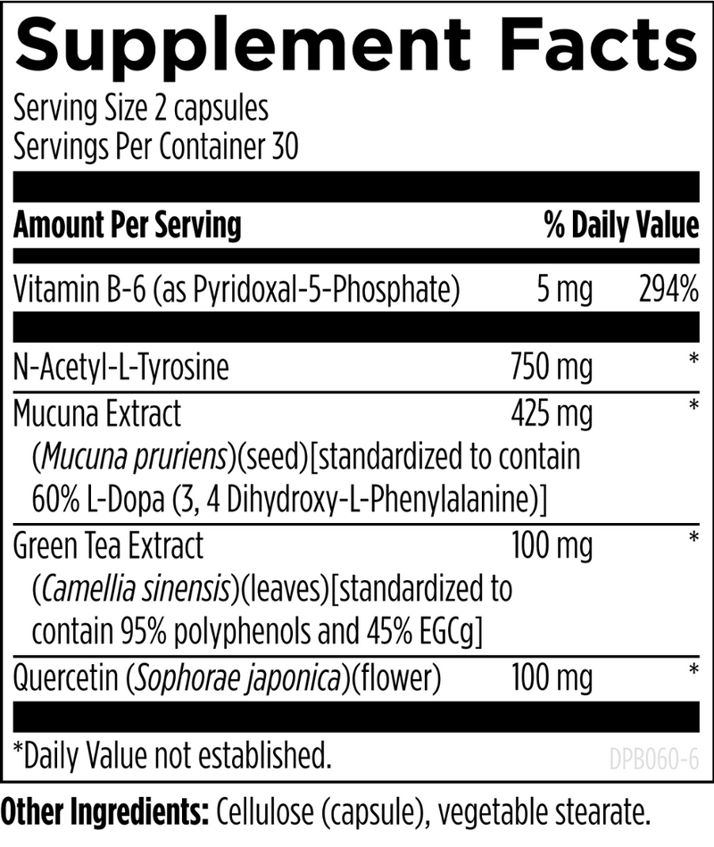 DopaBoos is designed to support the body’s natural production of dopamine, one of the primary catecholamines. Dopamine is essential for the normal functioning of the central nervous system and is associated with attention, learning, movement, balance, and mood regulation. The primary ingredient in DopaBoost is Mucuna pruriens, a botanical which naturally contains L-DOPA, the metabolic precursor to dopamine which can cross the blood-brain barrier. Additional ingredients include EGCg (epigallocatechin-3-gallate), acetyl L-tyrosine, quercetin and vitamin B6, all selected for their synergistic roles in helping to support the body’s natural production and regulation of dopamine.