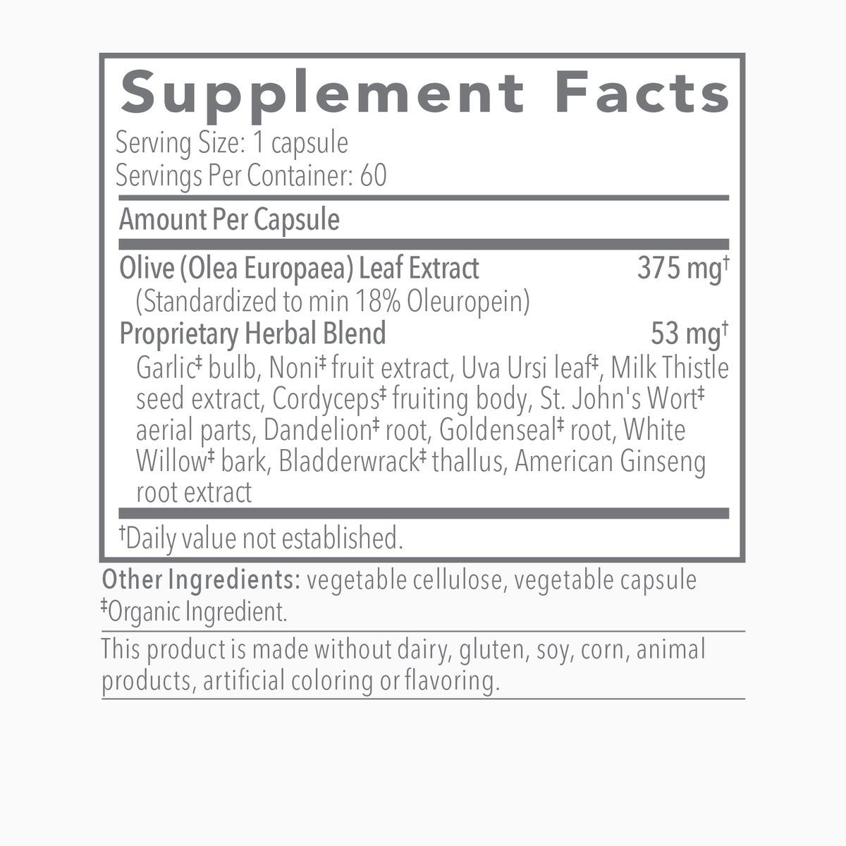 Additional select botanicals support olive leaf to open channels of detoxification within the kidneys, liver, and lymphatic function for natural toxin release.