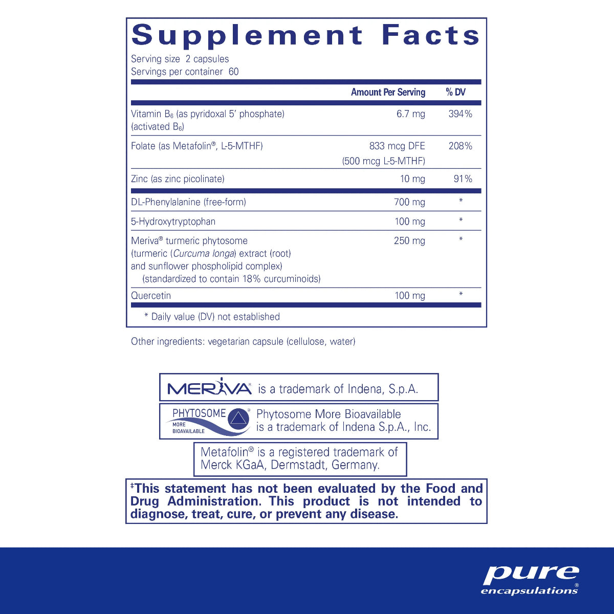 Included in the formula are vitamin B6, Metafolin® folate and zinc to support neurotransmitter production. Curcumin supports healthy serotonin receptor and monoamine oxidase enzyme function. Curcumin and quercetin maintain healthy cytokine balance to support neurotransmitter synthesis and emotional balance. It contains optimal serum levels of zinc and folate to promote positive mood.