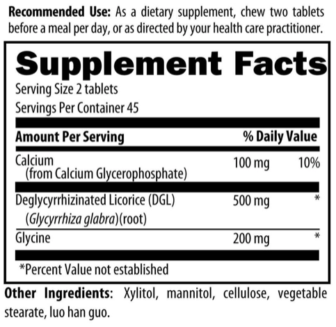 DGL Synergy™ is a fast-acting, chewable formula of deglycyrrhizinated licorice (DGL) that offers support for the gastric mucosa.* It contains a standardized high-quality form of DGL, the amino acid glycine, and calcium in the form of calcium glycerophosphate. DGL Synergy™ has a pleasant licorice flavor with zero grams of sugar and it does not contain fructose. It is sweetened with the polyols xylitol and mannitol, and the plant extract luo han guo.