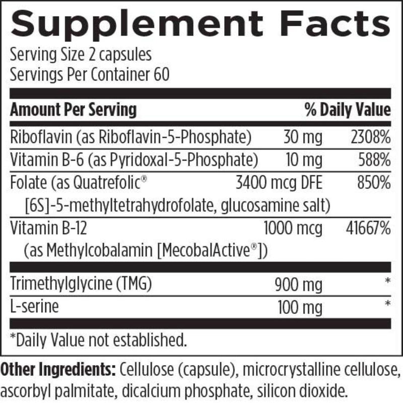 Homocysteine Supreme™ contains synergistic nutrients, including folate in the bioidentical, bioactive form, 5-methyltetrahydrofolate, known to facilitate the efficient metabolism of homocysteine. Homocysteine Supreme™ maintains a healthy homocysteine pathway, allowing for the normal production of its necessary and important end products. These include the sulfur-containing amino acids taurine and cysteine, and the neurotransmitters norepinephrine and dopamine. An optimally functioning homocysteine pathway provides methyl and sulfur groups for biochemical reactions, such as detoxification, healthy immune function, ideal joint and cartilage structure, and brain and cardiovascular health.*