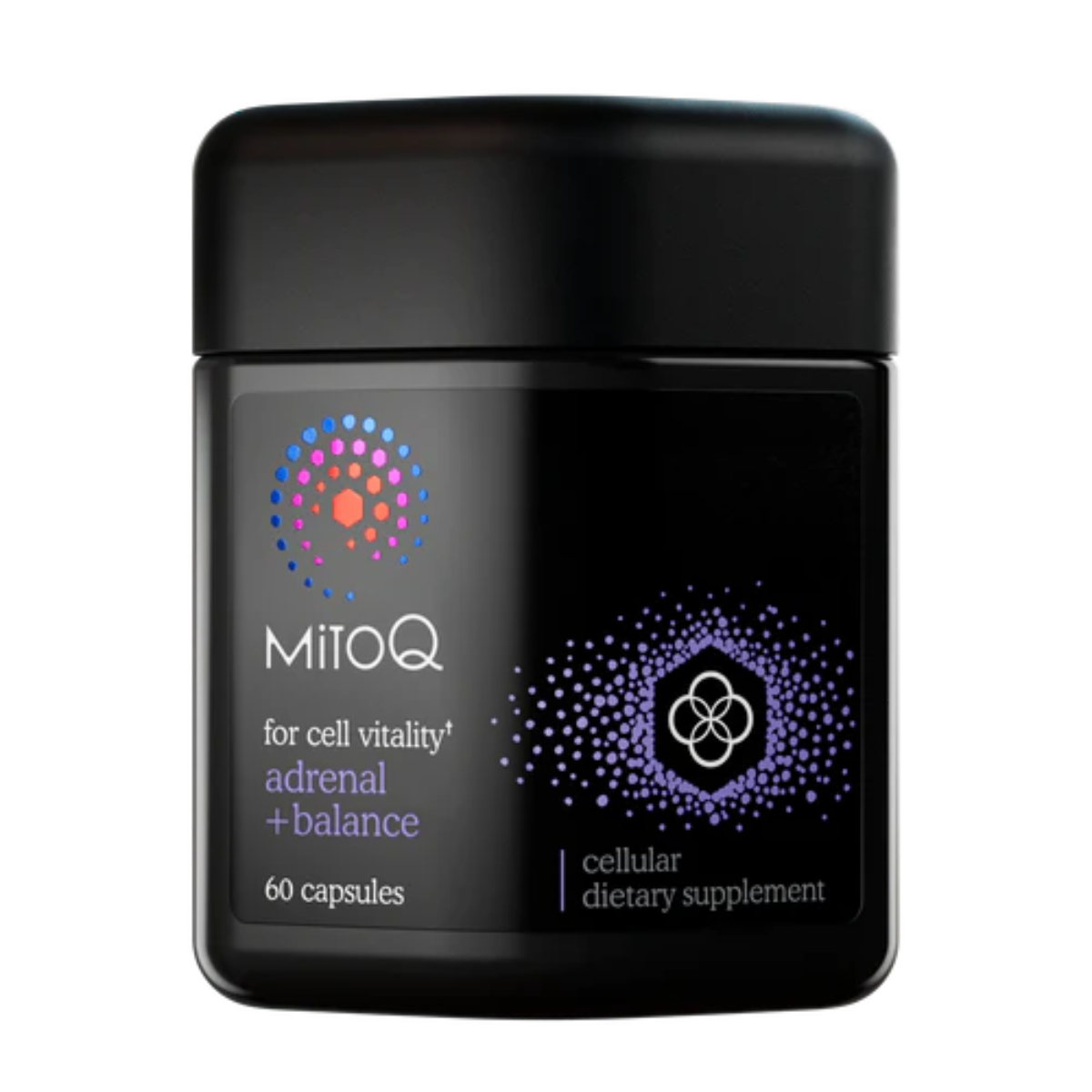 MitoQ Adrenal Balance ontains world-first mitochondria targeted antioxidant Mitoquinol Mesylate with, researched ingredients Ashwagandha, Rhodiola and Maritime Pine to support mood, healthy adrenal function and balanced cortisol.