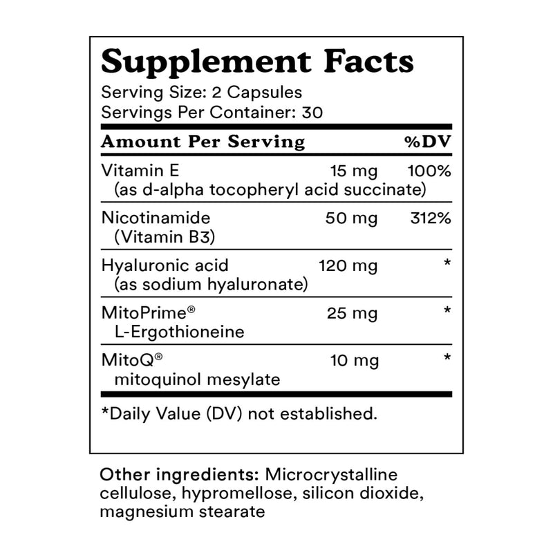 MitoQ Derma Elite is scientifically formulated with MitoQ® Mitoquinol, the world-first mitochondria-targeted antioxidant, and MitoPrime® Ergothioneine-an advanced, highly concentrated form of L-ergothioneine, produced through a proprietary fermentation-based method-to support youthful, healthy, and radiant skin at the cellular level. Results are further enhanced by additional skin health ingredients, including hyaluronic acid for hydration, nicotinamide (vitamin B3) for barrier repair and tone, and vitamin E for anti-photoaging protection.