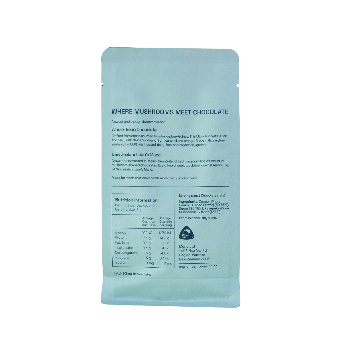 Each bag contains 28 individual mushroom-shaped chocolates. Every two chocolates deliver one full serving (1g) of New Zealand Lion’s Mane.