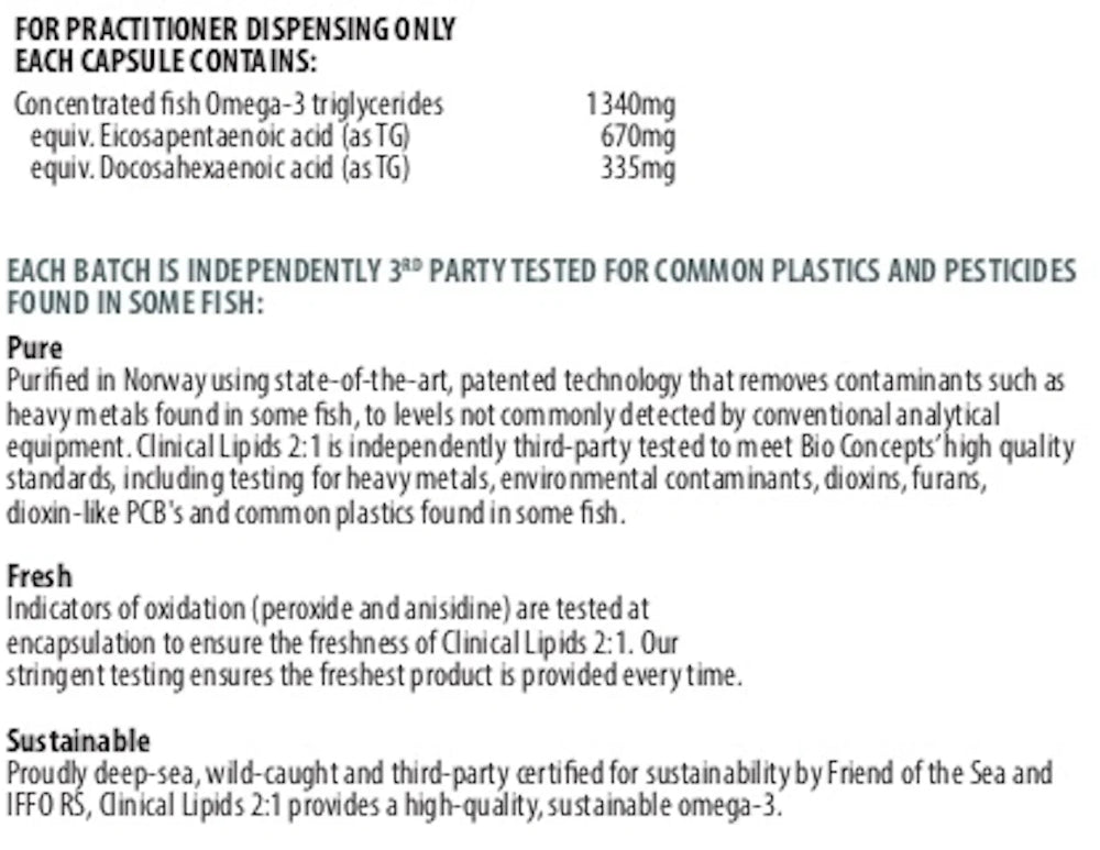 Purified in Norway using the state-of-the-art, patented technology that removes contaminates such as heavy metals found in some fish, to levels not commonly detected by conventional analytical equipment. Clinical Lipids 2.1 is independently third-party tested to meet Bio Concepts high quality standards, including testing for heavy metals, environments contaminants, dioxins, furans, dioxin-like PCB's and common plastics found in some fish.