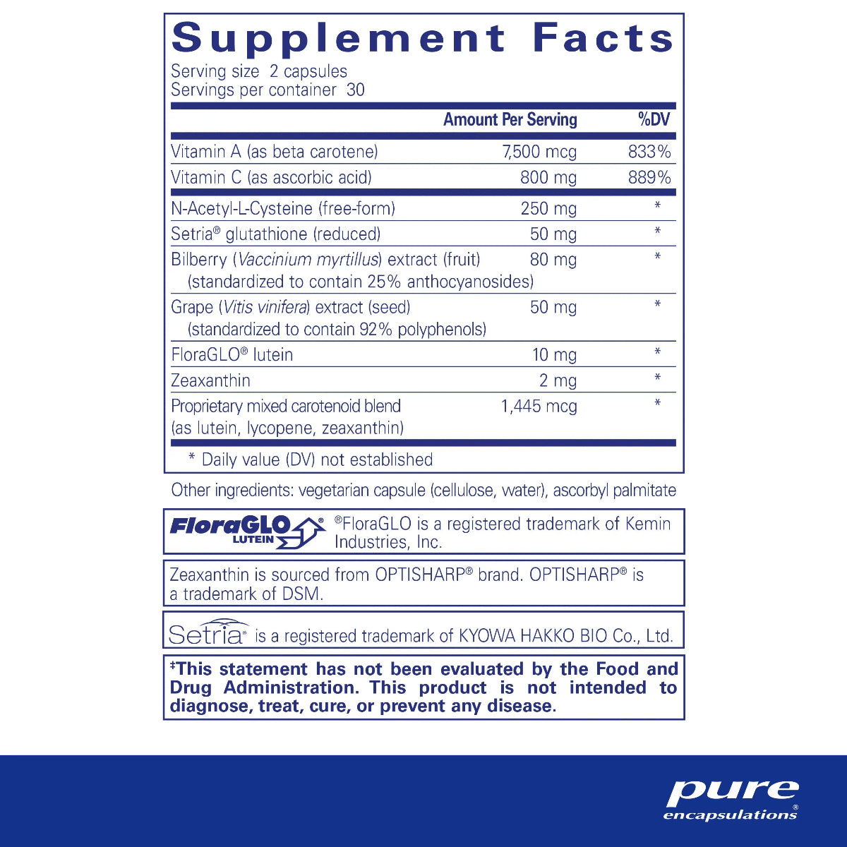 A vision supplement like Macular Support Formula by Pure Encapsulations provides NAC and Setria glutathione‚ as well as other botanical ingredients. The two carotenoids naturally found in macular pigment‚ zeaxanthin and lutein‚ support its density and integrity while also maintaining the optical lens. This product provides unique forms of these carotenoids to promote increased bioavailability and absorption: FloraGlo lutein and OPTISHARP Zeaxanthin. It also contains lycopene‚ another mixed carotenoid commonly found in tomatoes.