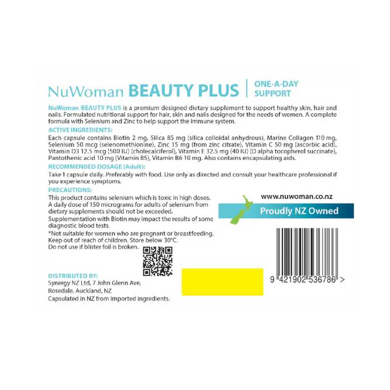 Each capsule contains Biotin 2mg, Silica 85mg (silica colloidal anhydrous), Marine Collagen 110mg, Selenium 50mcg (selenomethionine), Zinc 15mg ( from zinc citrate), Vitamin C 50mg (ascorbic acid), Vitamin D3 12.5mcg (500IU) (cholecalciferol), Vitamin E 32.5mg (40IU) (D alpha tocopherol succinate), Pantothenic acid 10mg (Vitamin B5), Vitamin B6 10 mg. Also contains encapsulating aids.