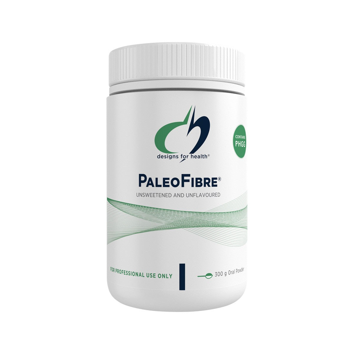 Paleofibre includes PHGG, Acacia gum, Bamboo fibre, Guar gum, Cranberry protein powder, Carrot powder, Chicory root inulin, Apple fibre, Glucomannan, Flaxseed, Psyllium husk, Apple pectin and prune powder, providing both soluble and insoluble fibre.