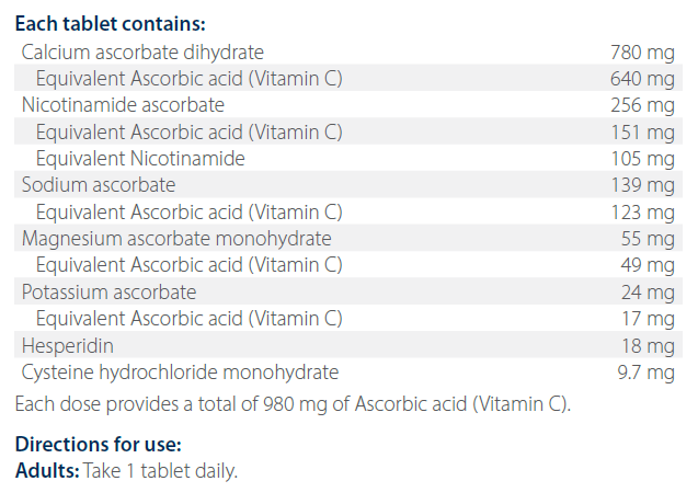 - Minimises gut irritation and provides enhanced absorption of vitamin C: Metagenics vitamin C contains mineral ascorbates that are buffered and therefore less acidic, helping to minimise gut irritation. The use of mineral ascorbates also provides valuable electrolytes including sodium, potassium, magnesium and calcium that are well absorbed. The pH adjusted vitamin C is combined with hesperidin, a flavonoid which works synergistically with vitamin C, enhancing absorption and inhibiting oxidation.