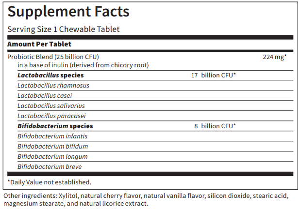 Ther-Biotic Kids (Children's Chewable) is a broad-spectrum, hypoallergenic probiotic supplement designed for children 2 years of age and older.